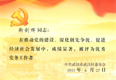 2011年6月,党委副书记靳剑辉同志被评为武昌区优秀党务工作者