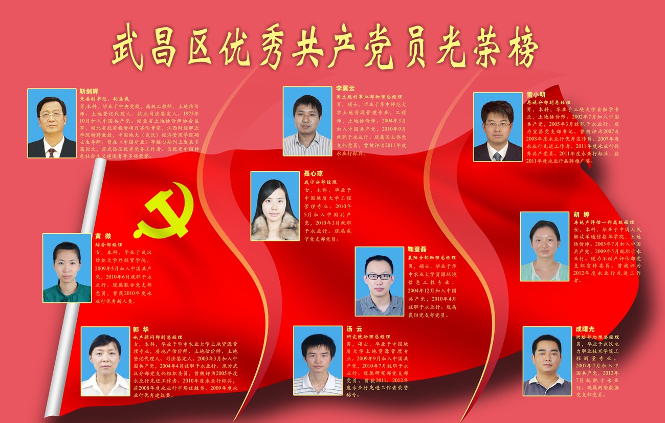 2013年7月,靳剑辉、黄微、郭华、聂心琼、李冀云、鞠登磊、汤云、成曙光、胡婷、雷小明10名同志被评为武昌区“优秀共产党员”